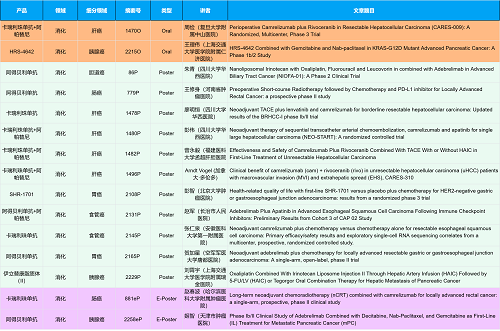 在消化系统肿瘤领域,BJL平台创新产品相关研究共入选2项口头报告、10项壁报和2项电子壁报,共14项研究。除了明星药物卡瑞利珠单抗和阿帕替尼外,还有5篇阿得贝利单抗治疗消化系统肿瘤的研究入选。此外,HRS-4642、瑞拉芙普-α注射液(SHR-1701)等未上市创新产品也有相应研究入选。随着新老药物前沿研究的不断推进,有望为消化系统肿瘤患者带来新的福音!